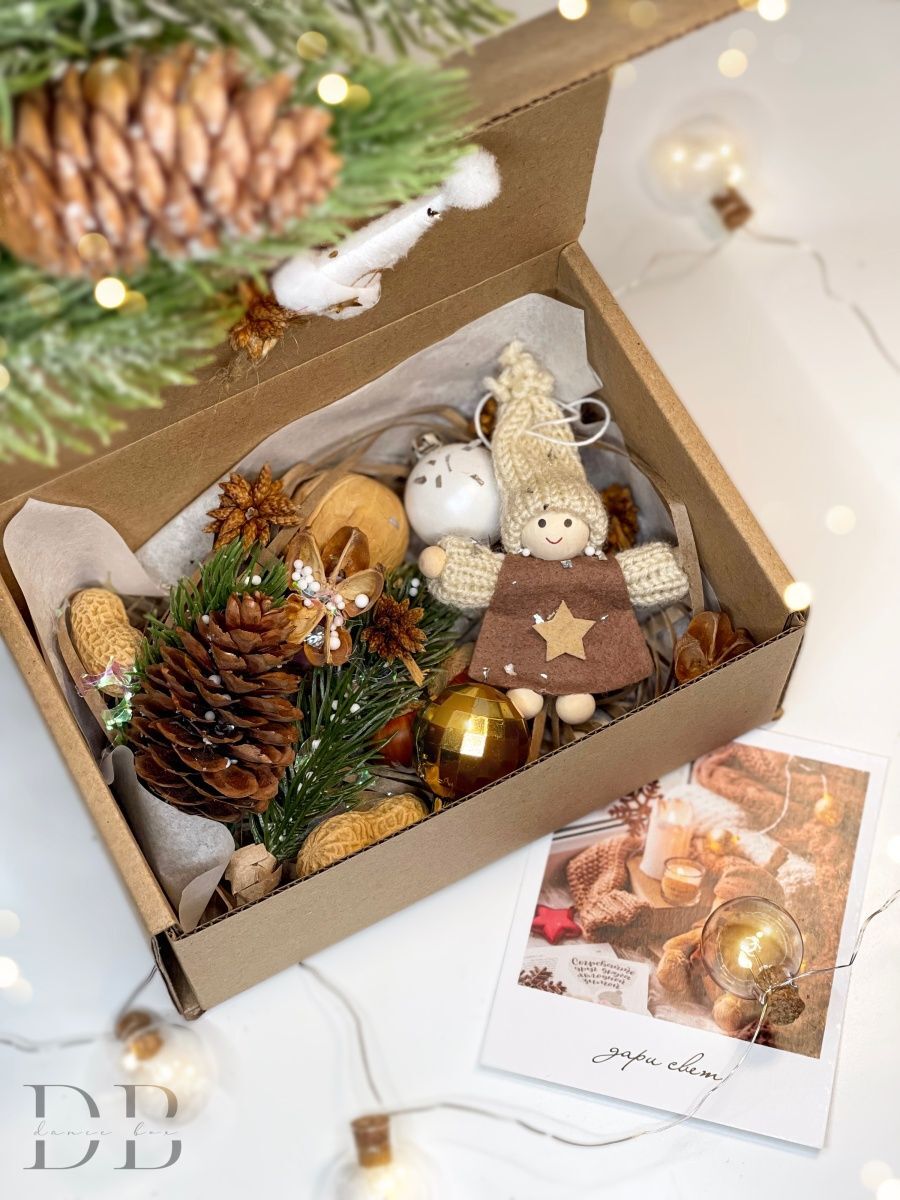 Крафт-коробочка с подарочным наполнением станет отличным поздравлением коллеге, другу или близкому человеку. Новогодняя подарочная коробочка содержит: - поздравительную открытку, - новогодние игрушки, - подарочный адресный стикер, - орешки и сухоцветы, - прочее наполнение. Коробочка станет отличным самостоятельным подарком (комплиментом), или же дополнит ваш сюрприз. P.S. Ключи от машины помещаются прекрасно!) *Содержимое может иметь отличие, так как каждый набор создается в ручную.