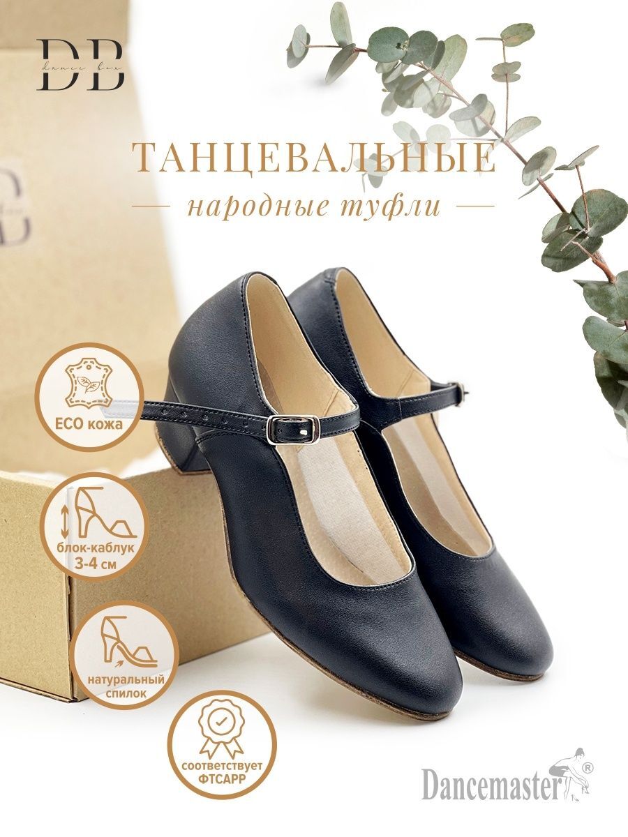 В танцевальном боксе "Dance Box" мы с заботой собрали для вас обувь от популярного российского производителя Dancemaster ( Дансмастер ), отвечающую всем установленным требованиям. Туфли для народных танцев имеют следующие особенности: чересподъёмный ремешок, прочно фиксирующий голеностоп и защищающий от травм; устойчивый каблук 3-4 см, подошва цельная из специальной плотной натуральной кожи. Данная модель полностью выполнена из натуральных материалов (кожи). Верх обуви - высококачественная экокожа, по своему функционалу не отличается от натуральной кожи, является более износостойкой и воздухопроницаемой. Достигай побед! Начни прямо сейчас!